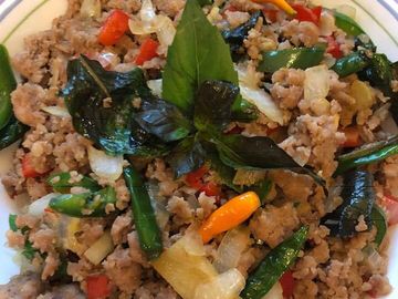 A stir-fry dish made with finely chopped or ground chicken cooked with chile peppers, garlic, and onions