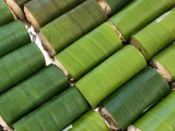 Steamed Glutinous Rice also known as Sticky Rice Wrapped in Banana Leaves filled with Spiced Chicken Floss